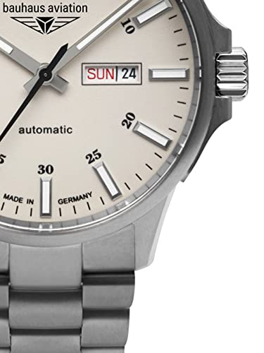 Bauhaus Aviation Herrenuhr mit Lederband oder Titanband Automatik Titangehäuse 10 ATM Saphirglas Tag Datum/DayDate 2866 (Beige/Titanband)