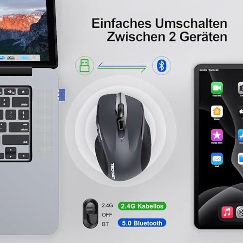 TECKNET Bluetooth Maus, Wiederaufladbare Maus Kabellos(DREI Modi: BT 5.0/3.0 + 2.4G), 4800 DPI, Ergonomische Leise Funkmaus für Laptops, Mac OS, Android, Windows, Grau