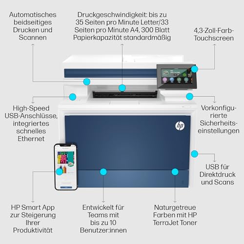 HP Color LaserJet Pro MFP 4302fdn Multifunktions-Farblaserdrucker, Automatischer beidseitiger Druck, Fax, Hohe Druckgeschwindigkeit, Bis zu 50.000 Seiten pro Monat, Wolf Pro Security