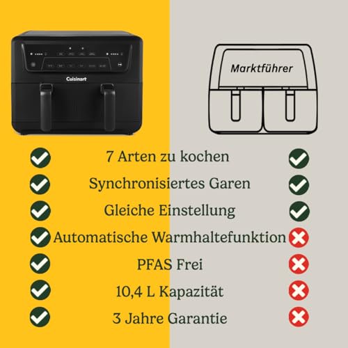 Cuisinart XXL 10.4L Zweizonen-Heißluftfritteuse| PFAS Frei | Chemiekalien frei,| Braten, Grillen, Backen, Dehydrieren und Warmhalten | 2 kammern| 2 x 5.2L - 8+ portionen| Spülmaschinenfeste Teile