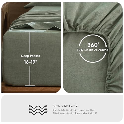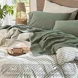 MooMee Bettwäsche-Set, 100 % gewaschene Baumwolle, leinenähnlich, strukturiert, atmungsaktiv, langlebig, weich, bequem, Queen-Size, Grün meliert