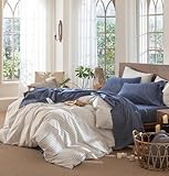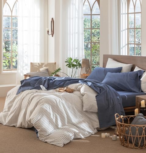 MooMee Bettwäsche-Set, 100 % gewaschene Baumwolle, leinenähnlich, strukturiert, atmungsaktiv, langlebig, weich, bequem (Blau meliert, Doppelbett)