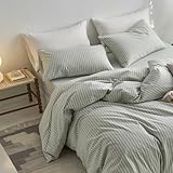 MooMee Gestreiftes Bettbezug-Set, 100 % gewaschene Baumwolle, leinenähnlich, strukturiert, atmungsaktiv, langlebig, weich, bequem, Salbeigrün, Weiß, breite Streifen, Doppelbett 172,7 x 228,6 cm