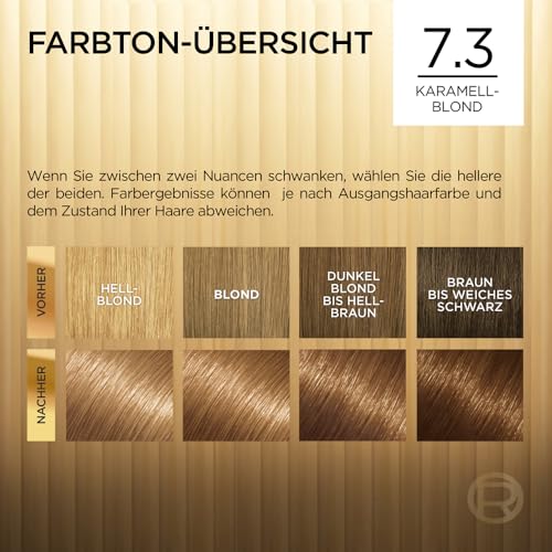 L'Oréal Paris Permanente Haarfarbe, Haarfärbeset mit Coloration und Farbglanz-Pflegebalsam, Préférence, 7.3 Karamellblond, 3er Set