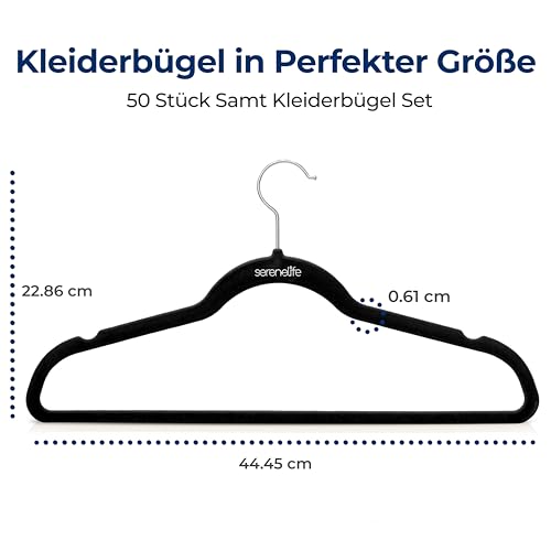 SereneLife Kleiderbügel Samt, 50 Stück- Bügel, Hangers- rutschfest & Platzsparend, Ultradünn mit 360° Haken, Robuste Kleiderbügel für Hemden, Hosen, Jacken & Krawatten – Schwarz