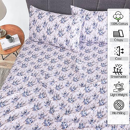 RUVANTI Bettwäsche aus 100% Baumwolle, 4-teiliges Bettwäscheset, blaues Blumenmuster, volle Größe, weicher, atmungsaktiver Stoff, Tiefe Bettlaken, 1 Spannbettlaken, 2 Kissenbezüge.