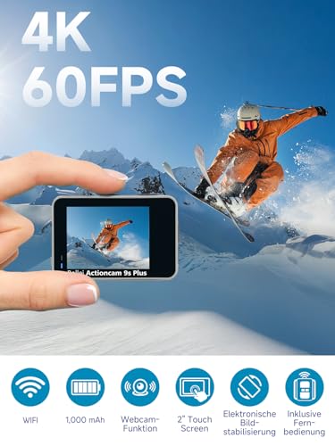 Rollei Action-Cam 9s Plus I 4K 60fps Unterwasserkamera mit Selfie-Display, Bildstabilisierung, Zeitraffer, Slow-Motion, Loop Funktion I Wasserdicht bis 10m, 65,5 x 43,8 x 26,5 mm